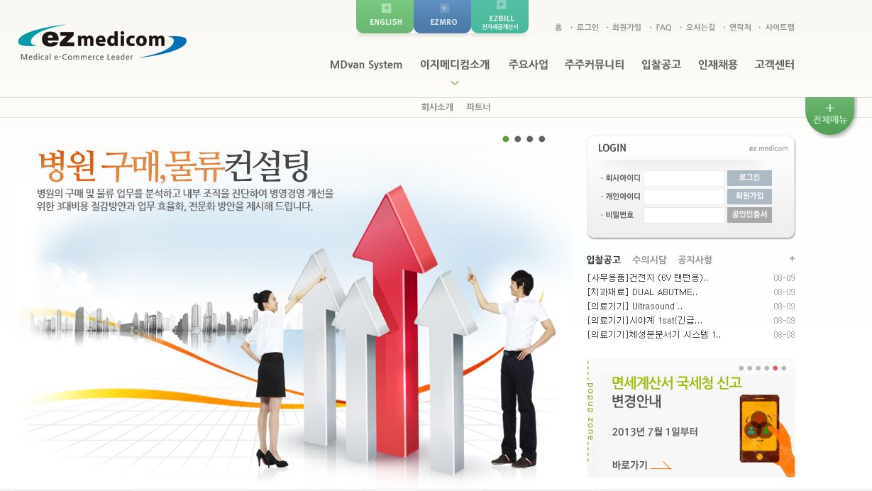 이번에 리뉴얼한 홈페이지에서는 이지메디컴의 전자상거래 노하우가 접목되어 있는 MDvan System과 컨설팅, 솔루션, 전자공동구매, 물류관리 등 이지메디컴의 주요사업 및 병원의 입찰공고 일정 등을 소개하고 있다.