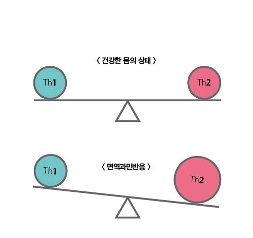 이 때 중요한 역할을 하는 것이 Th1(제1형 보조T세포)와 Th2(제2형 보조T세포)인데, 이들이 균형을 잃게 되면 Th2 반응이 지나치게 강해지고 이로 인해 IgE(면역글로불린E)라는 특정 항체가 과도하게 생산됨으로써 알레르기성 염증반응이 나타난다는 것.