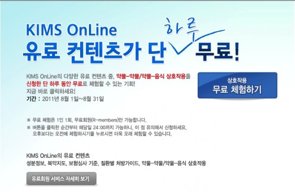 8월 한 달간만 무료 회원 대상으로 하루 동안 KIMS OnLine의 인기 유료 컨텐츠인 약물-약물 상호작용 정보와 약물-음식 상호작용 정보를 무료로 이용할 수 있다.
