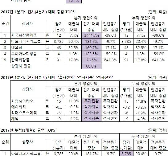 - 올 1분기 27개 국내 화장품 관련 상장사의 평균 영업이익은 281억원으로 전년 동기에 비해 3.3% 하락했지만 전기(16년 4분기)보다 60.8%...