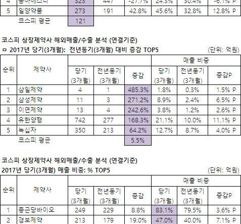 - 상장제약 1분기 수출 증감률...삼일 화일 대한 삼성 이연 순