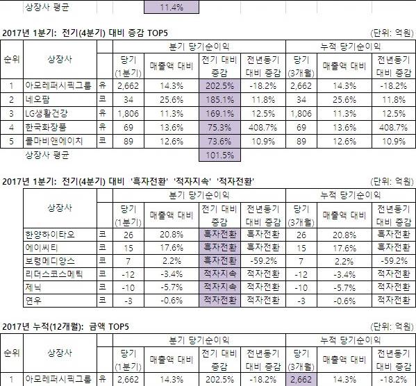 - 올 1분기 국내 주요 화장품기업의 순이익은 전년 동기에 비해서는 하락했지만 전기(16년 4분기)보다는 크게 성장한 것으로 나타났다.