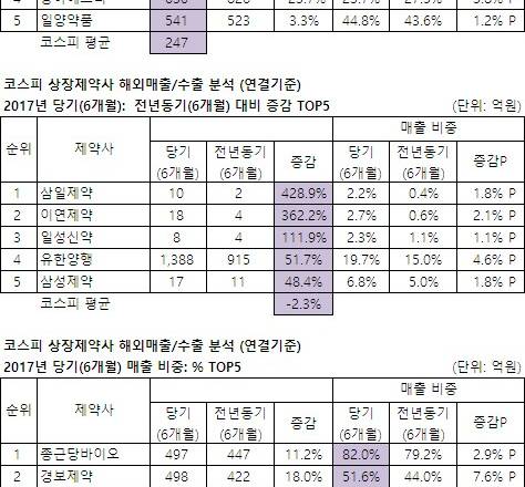 - 올해 상반기 코스피상장 제약사들의 전년동기대비 평균 해외매출/수출 증감률은 마이너스를 기록한 반면 코스닥상장 제약사들은 30...
