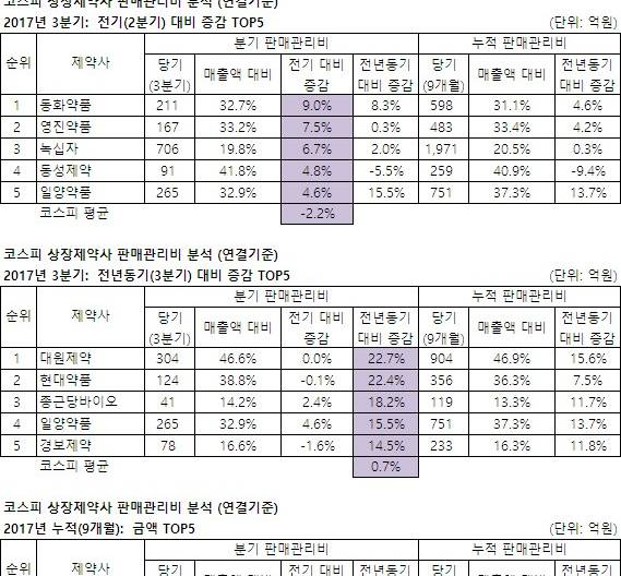 - 올해 3분기 누적 코스닥상장제약사의 평균 판매관리비 증감률이 코스피상장제약사보다 20배 이상 높은 것으로 나타났다. 매출액 대...