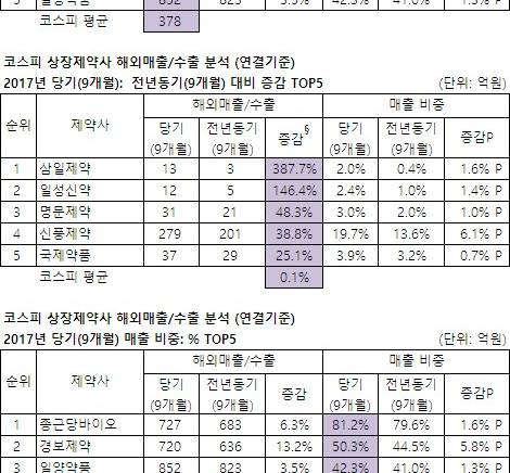 - 코스닥상장 제약사들의 올해 3분기 누적 매출비 평균 해외매출/수출 비중이 코스피상장 제약사들보다 2배 이상 높은&nbs...