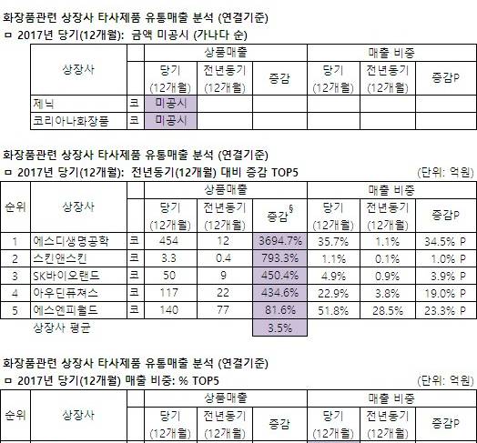 - 화장품 상장사 상품매출 소폭증가-2조 넘긴 LG생건 1위