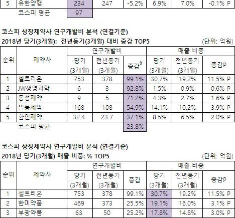 - 상장제약 1Q R&D 증가율 톱5 '엔지켐 파마리서치 셀트리온 JW생명 동성'