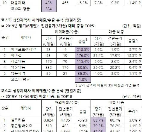 - 올해 상반기 코스피 상장 제약사는 전년동기대비 평균 해외매출/수출이 ‘소폭’ 증가한 반면 코스닥 상장 제약사는 10% 이상 감소했다. ...