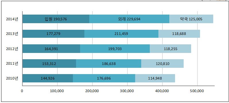 건강보험심사평가원이 최근 공개한 '2015년 1분기 진료비통계자료'에 따르면, 2015년 1분기 요양급여비용은 14조 190억원으로, 전년 동기 대비 7.2% 증가했다.