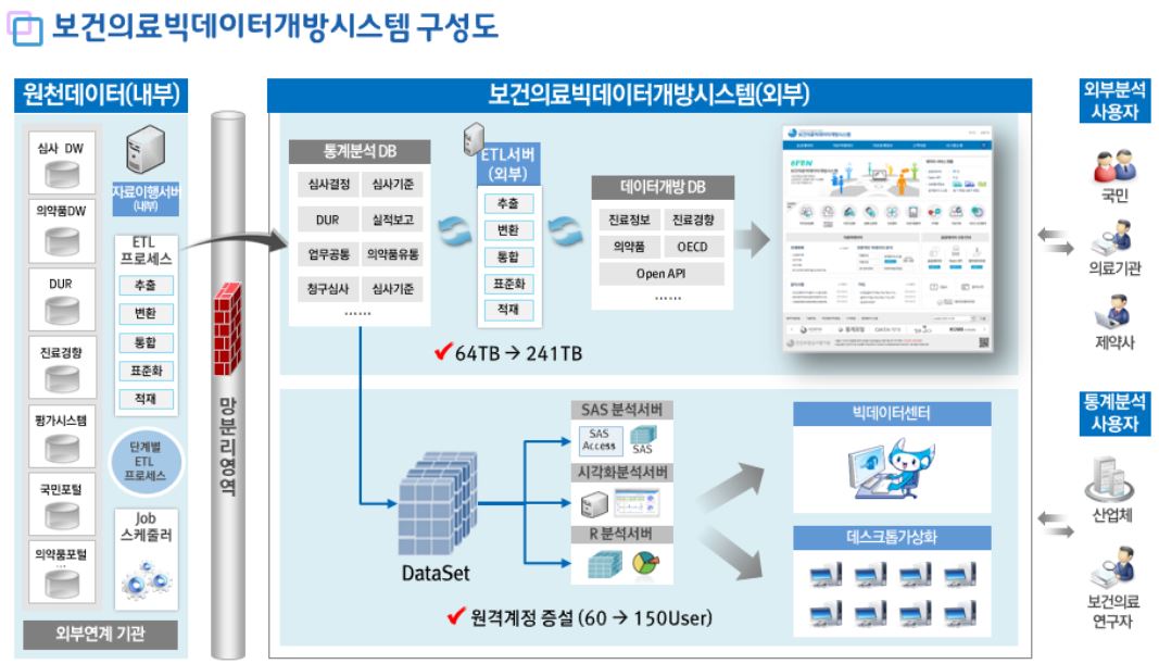 심사평가원의 보유 빅데이터는 의료기관, 제약회사 등 보건의료산업분야 및 식품의약품안전처, 국민건강보험공단 등 유관기관에서 다양한 경로로 수집한 의료분야 공공데이터(약 2조 8,879억 건, 약 192TB)로, 개방범위는 ‘진료정보’ 등 7개 분야 18개 DB와 함께 2007년부터 누적된 약 3,258억 여건에 달하는 방대한 데이터를 모두 개방한다.