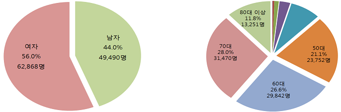 성별로는 남자 44.0%, 여자 56.0%로 여자가 약 10% 이상 많았으며, 연령대별로는 70대가 28.0%로 가장 많았고, 60대가 26.6%, 50대가 21.1%, 80세 이상이 11.8% 순이었고, 70대 이상의 고령층이 39.8%를 차지했다.