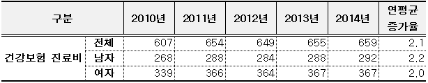 연평균 증가율을 살펴보면, 전체의 경우 2010년 약 607억 원에서 2014년 약 659억 원으로 연평균 2.1% 증가했다.
