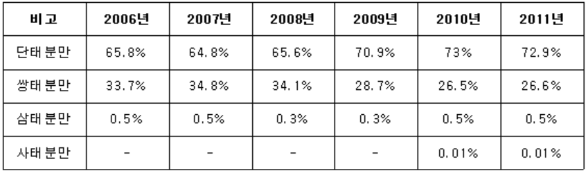 다태아 출산은 산모의 합병증 치료기간을 늘리고 조산율을 높이며, 미숙아를 출산할 확률이 단태아에 비해 15배가 높다는 게 국회 입법조사처의 분석이다.
