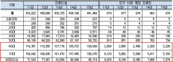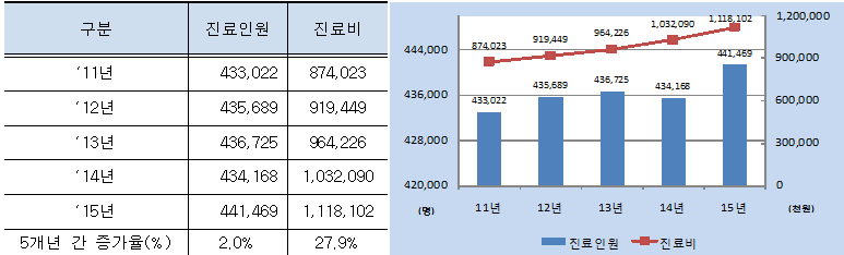 진료비는 4년 간 8,740억 원(2011년)에서 1조 1,181억 원(2015년)으로 2,441억 원(27.9%↑)증가했다.