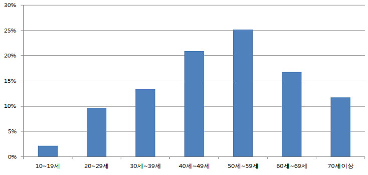 2016년 충청지역의 ‘만성치주염’ 연령별 진료인원은 50대(25.2%)>40대(20.9%)>60대(16.8%)>30대(13.4%) 순으로, 50대 환자가 가장 많았다.