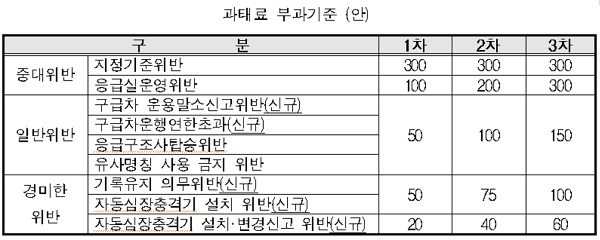 구급차에 대한 위반기준은 업무정지처분 기준에서도 신설됐다.