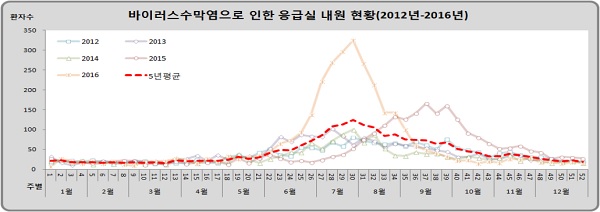 국립중앙의료원 중앙응급의료센터가 지난 5년간(2012년~2016년)의 응급의료 데이터를 분석한 결과, 바이러스수막염으로 인한 응급실 내원 환자가 더위가 시작되는 6월부터 증가해 7월에 가장 많은 것으로 나타났다.