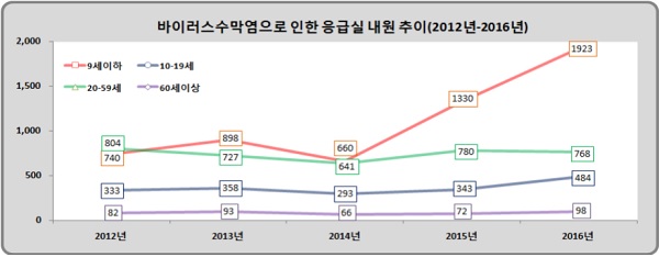지난 5년간 응급의료센터에 내원한 바이러스수막염 환자를 분석한 결과, ‘12년 1,959명에서 ’16년 3,273명으로 1.7배가 증가한 것으로 나타났으며, 9세 이하는 2012년 740명에서 2016년 1,923명으로 2.6배가 증가한 것으로 나타났다.