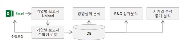 분석시스템은 기업 별 R&D 투자 성과 계산, 기업 분류별 성과분석, 기업간 성과지표 비교, 연도별 시계열 분석 화면 등을 구현하고, 성과지표의 챠트, 그래프, 표 등으로 재생성할 수 있는 디자인·편집 기능 및 출력 기능 제공하도록 한다.