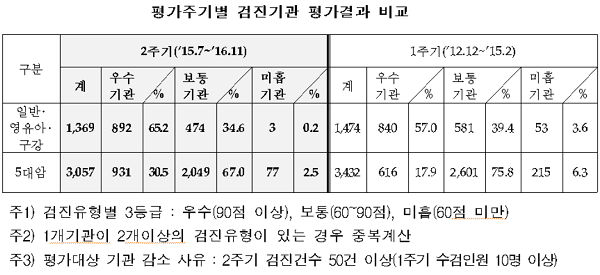 평가결과, 일반‧영유아‧구강검진기관은 우수기관 비율이 65.2%로 1주기의 57.0%에 비해 8.2%p 증가했으며, 미흡기관은 0.2%로 1주기의 3.6%에 비해 3.4%p 감소했다.