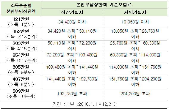 본인부담상한제는 과도한 의료비로 인한 경제적 부담을 덜어주기 위해 연간(1.1.~12.31.) 본인일부부담금(비급여, 선별급여 등 제외)의 총액이 개인별 상한금액(’16년 기준 121~509만원)을 초과하는 경우 그 초과금액을 건강보험공단이 부담하는 제도이다.