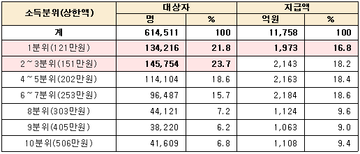 적용 대상자의 약 46%가 소득분위 하위 30% 이하에 해당하였으며, 지급액은 소득분위 하위 10%가 전체 지급액의 16.8%를 차지하여 다른 소득분위별 지급액 비율(9.0~9.4%) 보다 약 2배 높은 것으로 나타났다.