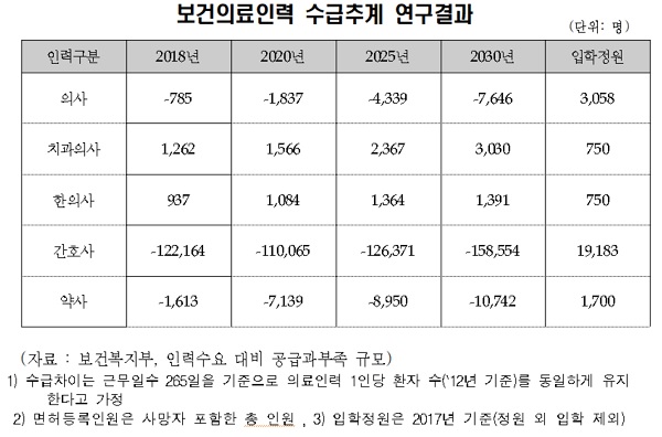 3년 후인 2020년에는 약사, 의사 각각 7,139명, 1,837명 부족, 2025년에는 8,950명, 4,339명 부족, 2030년에는 1만742명, 7,646명이 부족한 것으로 나타났다.