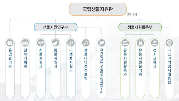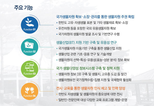 국립생물자원관은 ‘아시아 No.1(최고) 생물자원의 보고(寶庫)’라는 2020 비전을 갖고 ‘생물다양성 보전 역량 강화’ ‘생물자원 산업화 지원체계 선진화’ ‘생물자원 총괄관리 리더십 구현’ ‘지속가능한 경영기반 강화’ 등의 구체 전략을 추진 중이다.