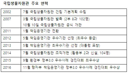 국립생물자원관의 2016년 주요 성과로는 먼저 자생생물 조사•발굴 등을 통해 국가생물종목록 4만 7000여 종을 구축했다. 더불어 나고야의정서 대응능력 강화를 위해 미얀마 등 생물자원부국과 MOU를 체결하는 등 신뢰구축에 앞장섰다.