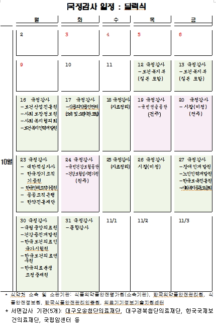10월 12, 13일 보건복지부를 대상으로 한 국정감사가 진행되고, 17일에는 식품의약품안전처를 대상으로 실시된다.