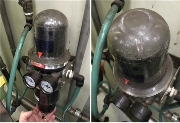 현장에서 발견된 압축공기 필터는 심각하게 오염된 상태로, 내부에 활성탄과 다량의 수분으로 인한 곰팡이 등이 확인됐다. 본래 흰색을 보여야 하는 필터 내부는 새까맣게 때가 끼어 있었고, 전혀 관리되지 않은 상태로 방치되고 있었다.