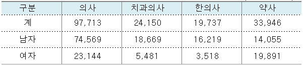 요양기관 근무 인력(의사, 치과의사, 한의사, 약사) 성별 지역별 현황은 전체인력 성별 비율은 남자 70.4%(123,512명), 여자 29.6%(52,034명)으로 여성 비율 높은 지역은 서울, 대구, 경기, 광주이며 여성 비율 낮은 지역은 전남, 충남, 경북, 충북으로 나타났다.