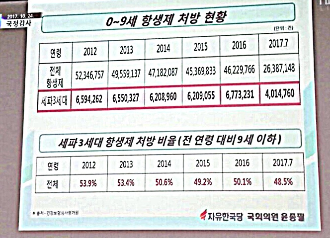 자유한국당 윤종필 의원은 24일 국민건강보험공단·건강보험심사평가원 국정감사에서 0~9세 항생제 처방 현황을 통해 이를 지적했다.