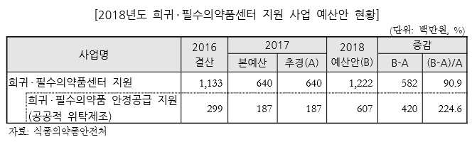 희귀·필수의약품센터 지원 사업의 2018년도 예산안은 12억 2,200만원으로 전년대비 5억 8,200만원(90.9%) 증가했다. 이중 희귀·필수의약품 안정공급 지원(공공적 위탁제조)을 위한 예산은 2017년 1억 8,700만원에서 2018년 6억 700만원으로 증가(4억 2000만원 증가)했다.