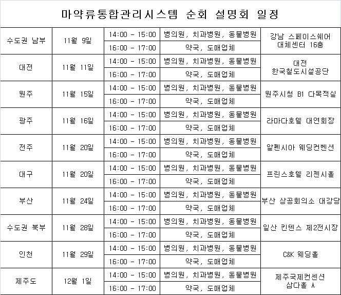한국의약품안전관리원은 지난 9일 서울을 시작으로 12월 제주를 끝으로 총 10차례에 걸쳐 마약류통합관리시스템 전국 순회 설명회를 진행한다.
