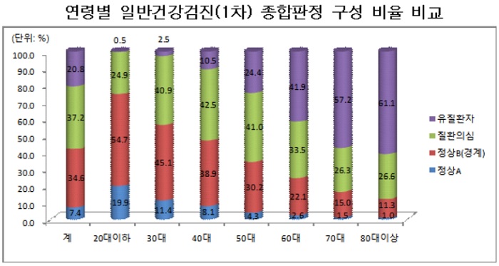 20대 이하는 정상판정비율(정상A, 정상B)이 75%로 나타났으나 70대 이상은 질환을 가지고 있는 사람(유질환자)이 약 57%를 차지했다.
