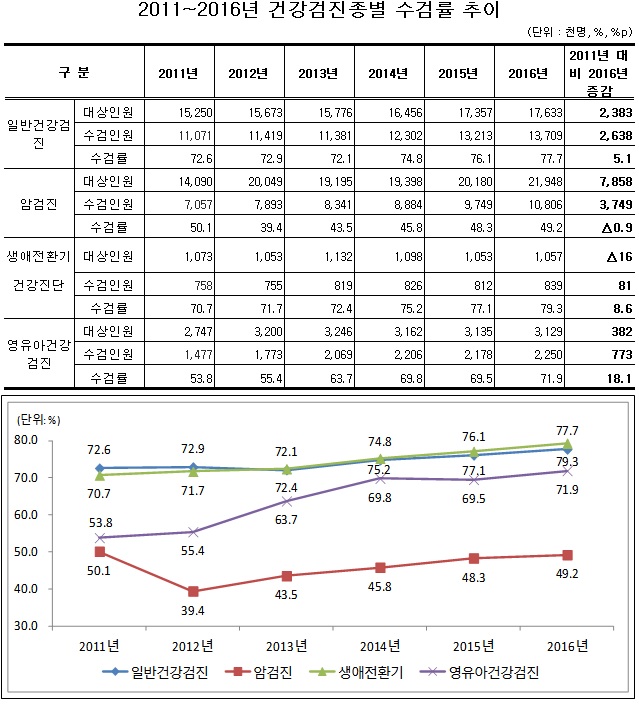 최근 5년간 건강검진 종별 수검률을 비교해 볼 때, 일반건강검진은 2011년 72.6%에서 2016년 77.7%로 5.1%p 증가했으며, 생애전환기건강진단은 8.6%p 증가, 영유아건강검진은 18.1%p 증가했다.