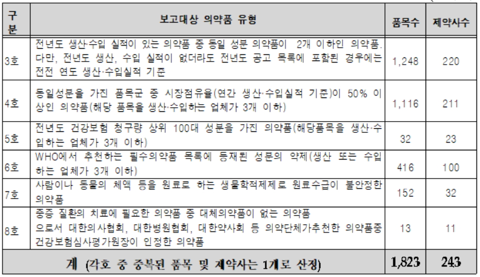 2017년 '생산·수입·공급 중단 보고대상 의약품'으로 선정된 의약품은 1,823품목(243개 제약사)이며, 이 중 ‘전년도 생산·수입 실적이 있는 의약품 중 동일성분 의약품이 2개 이하인 의약품’이 1,248개(220개 제약사)로 가장 많았다.