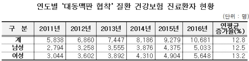 국민건강보험공단(이사장 직무대리 김필권)은 2011~2016년 건강보험 빅데이터를 분석한 결과, '대동맥판협착(I13.50) 질환'으로 진료를 받은 진료인원은 2011년 5,838명에서 2016년 1만681명으로 연평균 12.8% 증가했다.