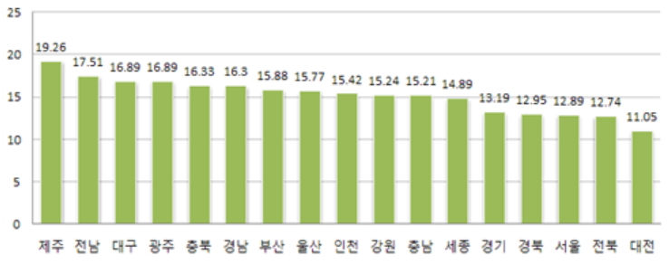 지역별로는 부모 모두 비만인 경우의 자녀 비만율은 제주특별자치도(19.26%) 〉전라남도(17.51%) 〉대구광역시‧광주광역시(16.89%) 순으로 높게 나타났고, 대전광역시(11.05%)〈 전라북도(12.74%)〈 서울특별시(12.89%) 순으로 낮게 분석 됐다.