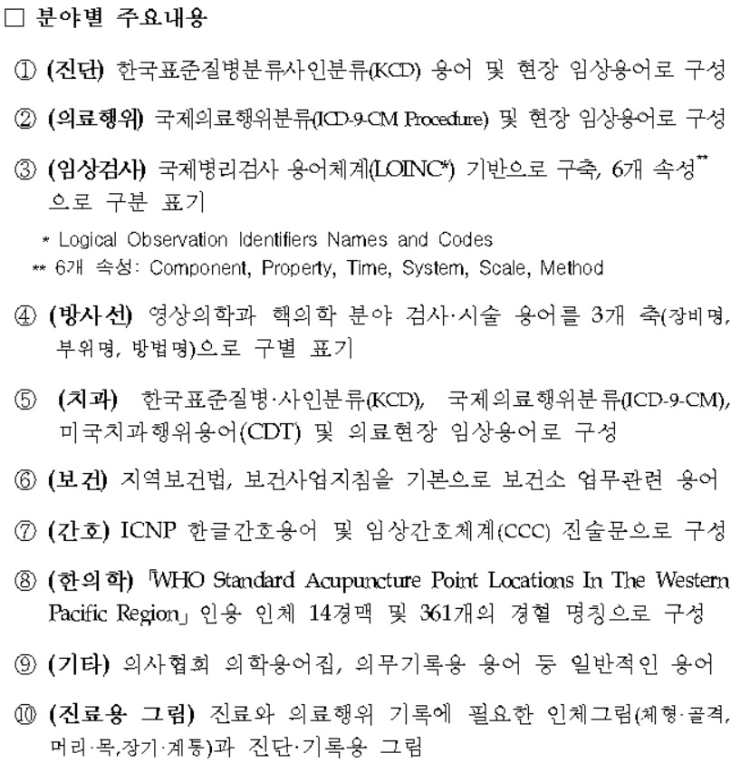 또한 진료기록 작성에 필요한 질병, 수술, 검사, 방사선, 치과, 보건 등 보건의료분야 용어의 집합체로써 10개 부문별 용어를 포괄적으로 수록하고 있다.