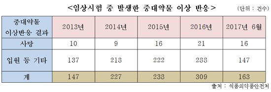 임상시험 규모가 커지면서 부작용도 적지 않게 발생하고 있는데, 임상시험 중 발생하는 중대하고 예상하지 못한 약물이상 반응 현황은 2013년 147건, 2014년 227건, 2015년 238건, 2016년 309건 등 해마다 늘고 있다.