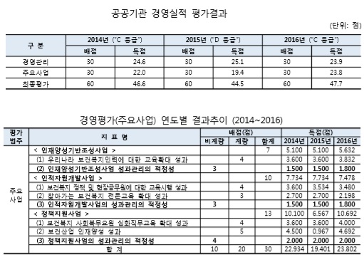 감사결과 주요내용을 보면, 한국보건복지인력개발원(이하 개발원)은 공공기관 경영실적 평가결과가 2014년 C등급, 2015년 D등급에 이어 2016년 C등급으로 저조한 것으로 확인됐다.