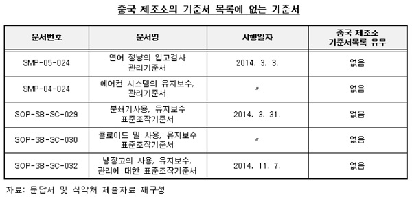 뿐만 아니라 A사가 제출한 중국 제조소의 기준서와 기준서 목록을 비교한 결과, A사는 중국 제조소 기준서 목록에 기재돼 있지 않은 문서번호 SMP-050024 '연어 넝낭의 입고검사 관리 기준서' 등 중국 제조소의 기준서 목록에 없는 5개 기준서를 제출한 것으로 확인됐다.