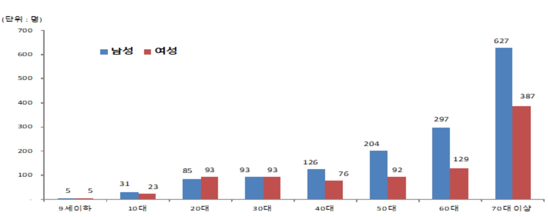 남성은 70대 이상(1만 1천 명, 27.3%)이 가장 많았고, 50대(8천 4백 명, 21.0%), 60대(7천 5백 명, 18.6%) 순이며, 여성은 70대 이상(9천 9백 명, 36.1%)이 가장 많았고, 50대(3천 8백 명, 13.7%), 60대(3천 4백 명, 12.5%) 순으로 나타났다.