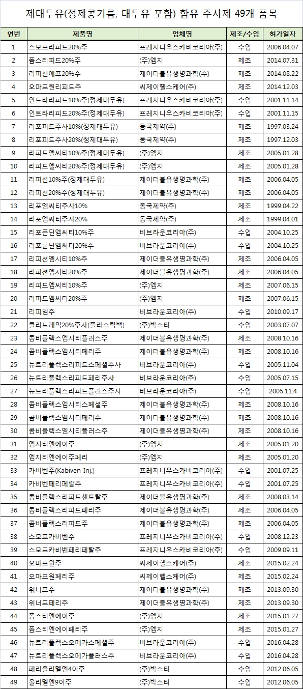 정제대두유 함유 주사제는 정제콩기름, 대두유가 포함된 주사제로, 비경구 영양요법을 필요로 하는 환자(경구 혹은 위장관 영양공급이 불가능, 불충분 또는 제한되는 경우)에게 에너지와 필수지방산 및 오메가-3 지방산을 공급하는 제품이다.