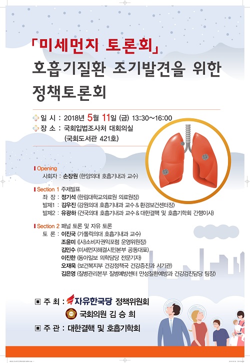 자유한국당 김승희 의원과 자유한국당 정책위원회가 공동주최하고, 대한결핵 및 호흡기학회가 주관하는 '호흡기질환 조기발견을 위한 미세먼지 정책토론회'가 오는 11일 오후 1시 30분 국회입법조사처 대회의실에서 개최된다.