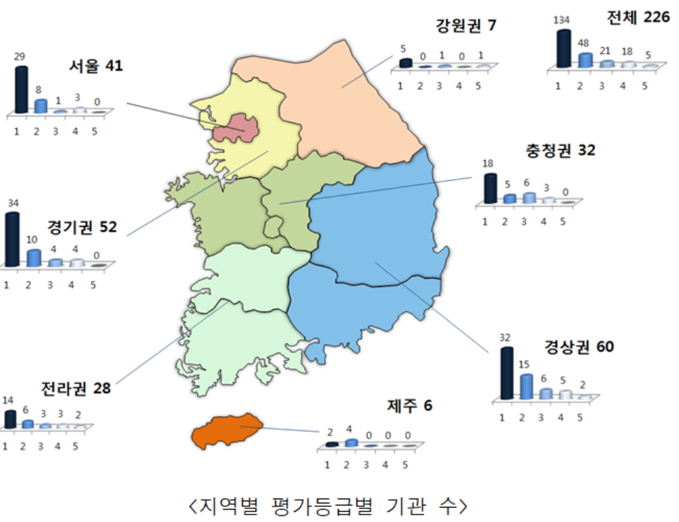 심사평가원 평가 대상 총 246기관 중 종합점수가 산출된 기관은 226기관이고, 이 중 1등급 기관은 134기관(59.3%)으로 나타났다. 1등급 기관은 전국에 분포돼 있는 것으로 나타났다.