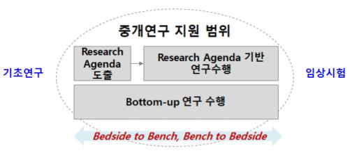 이번 사업은 보건의료R&D 전체 과정 중 기초연구 이후부터 초기 임상시험(연구자주도 임상시험, Investigator Initiated Trial)까지가 중개연구 영역이며, 수요 기반 특정질환 문제 해결 목적 연구들을 선별해 지원한다.