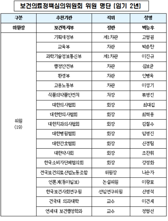 보건의료정책심의위원회는 보건복지부장관을 위원장으로 하고, 7개 부처 차관급 공무원, 수요자와 공급자를 대표할 수 있는 위원과 보건의료정책 전문가를 포함하여 총 20인으로 구성했다.